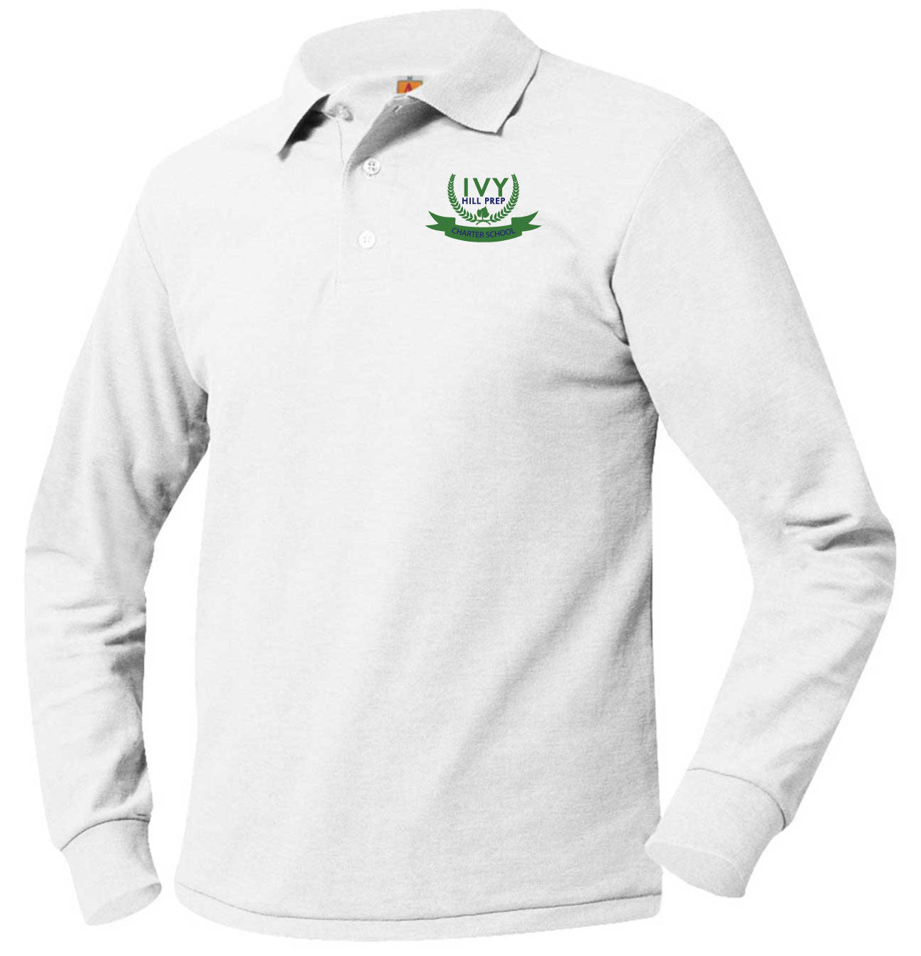 IVY HILL PREP LONG SLEEVE PIQUE POLO. AVAILABLE IN WHITE OR KELLY GREEN WITH SCHOOL LOGO