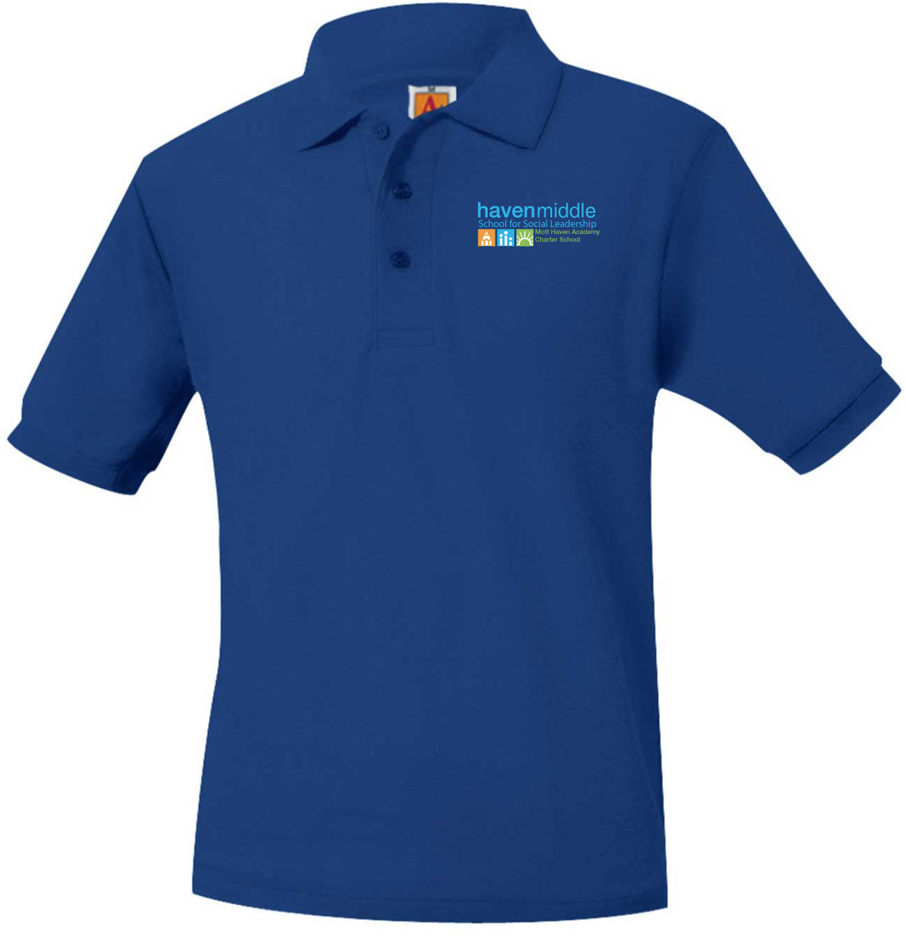 HAVEN MIDDLE SCHOOL SHORT SLEEVE PIQUE POLO SHIRTS. AVAILABLE IN ROYAL BLUE AND KELLY GREEN WITH SCHOOL LOGO